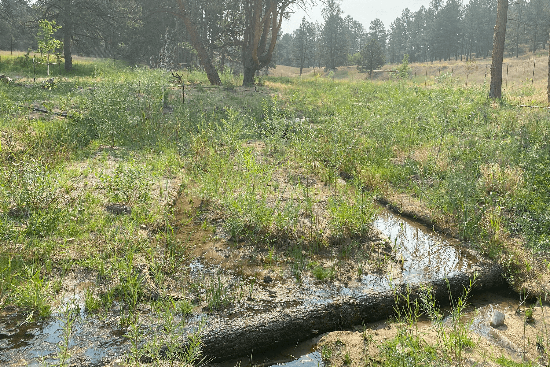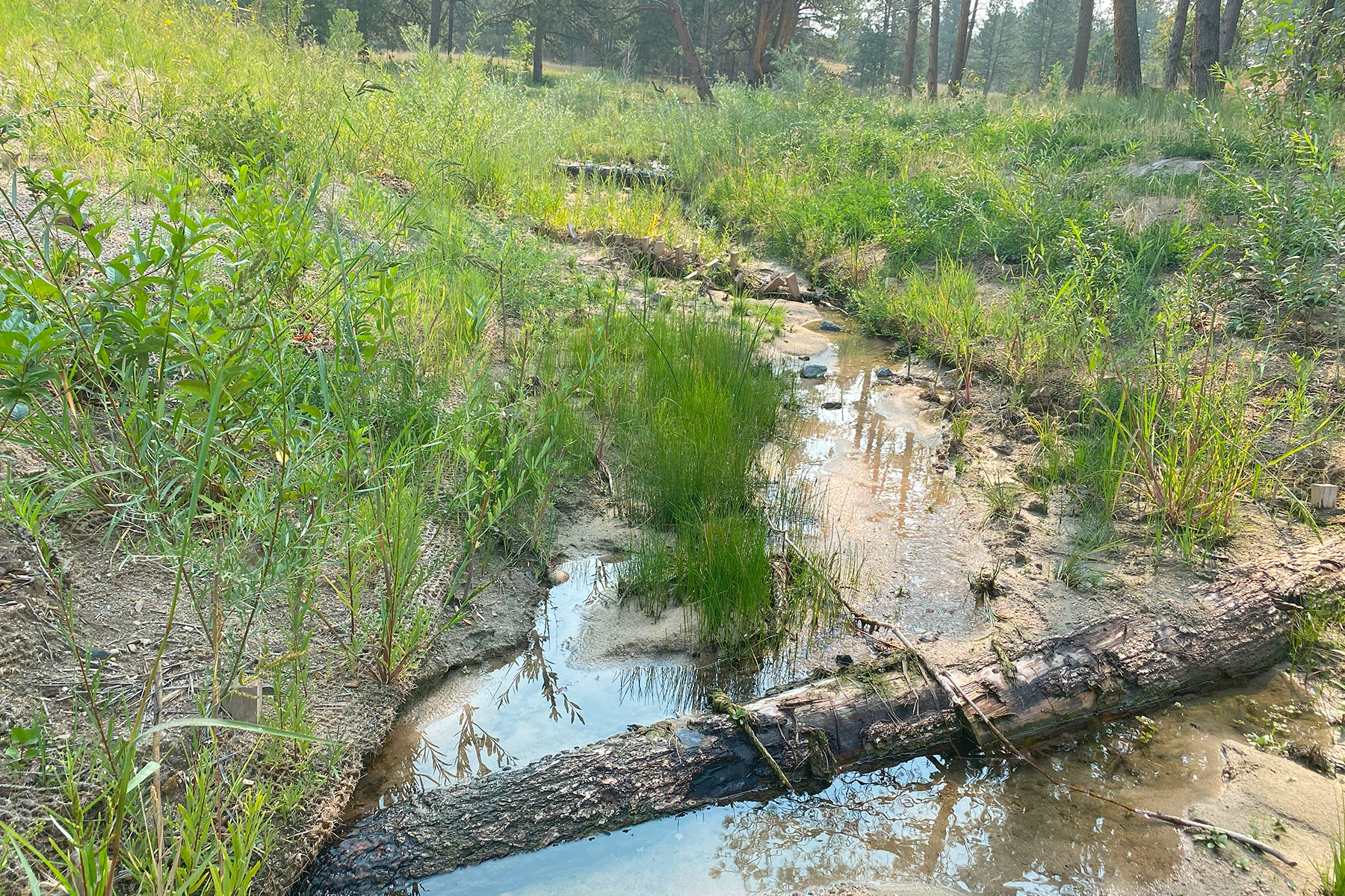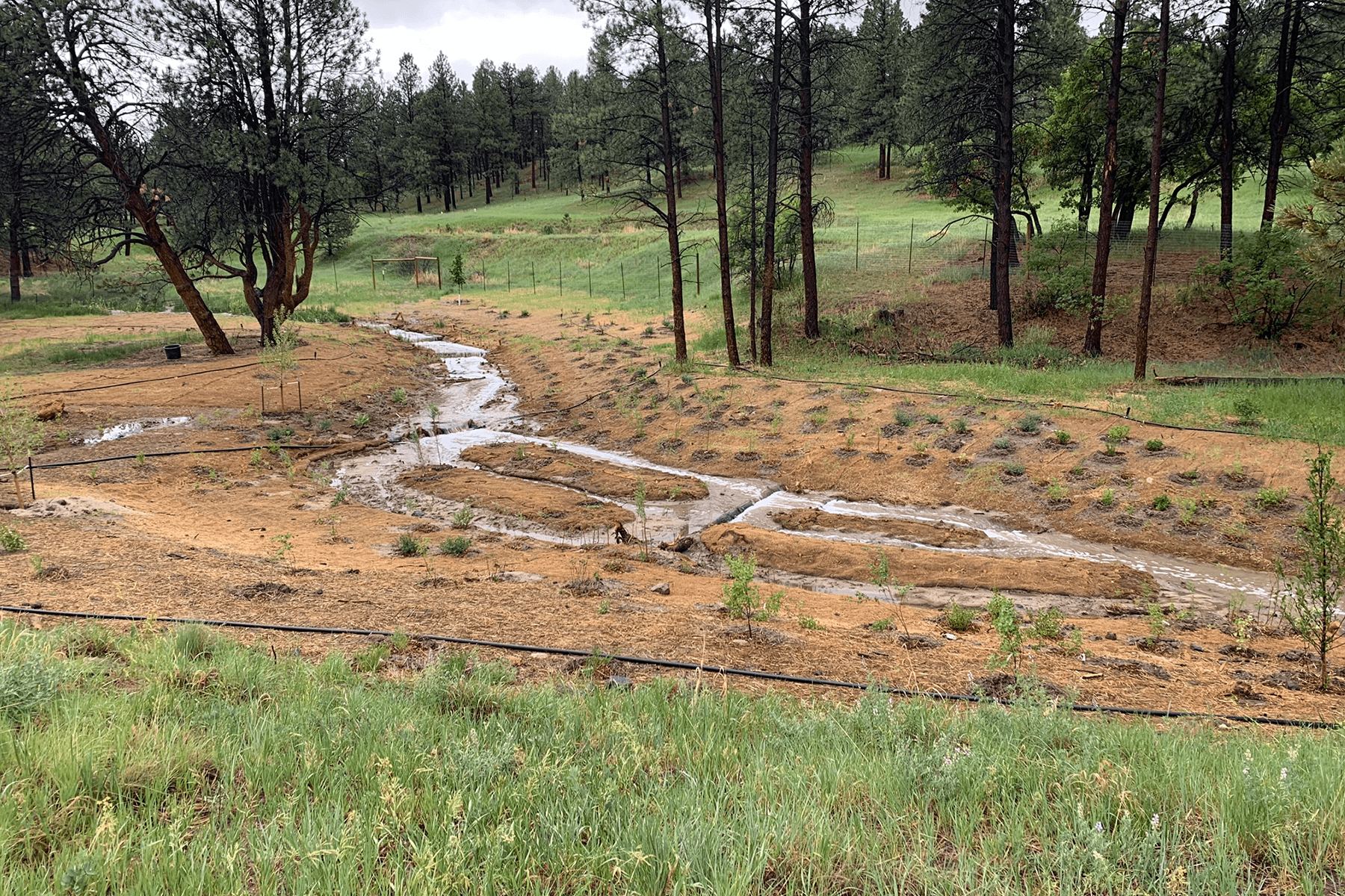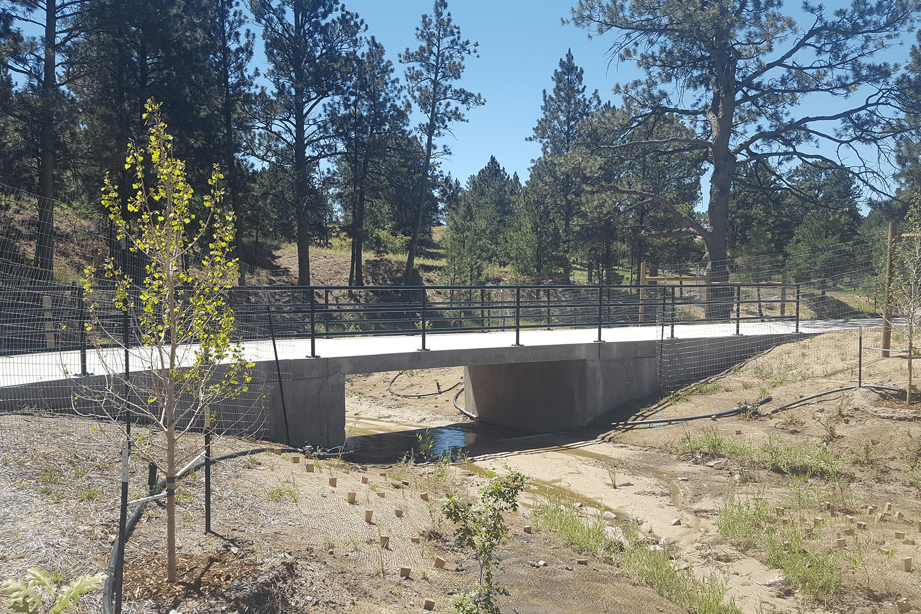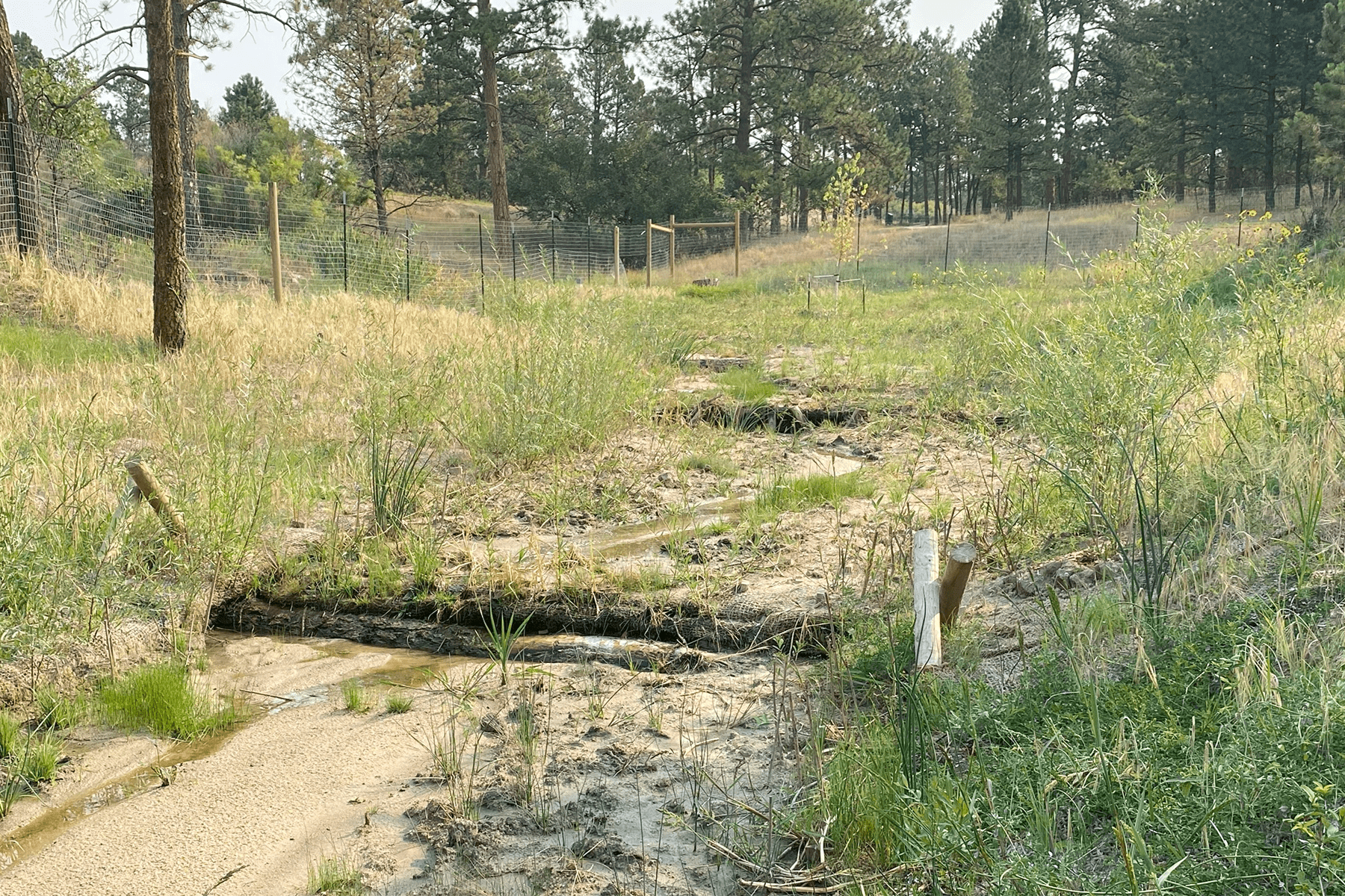 Muller performed design engineering for roughly 3,700 linear feet of channel stabilization improvements to an upper portion of Timbers Creek located at elevations 6,200 to 6,300. This portion of Timbers Creek has intermittent flow, an active sand bed, and is situated within a mature Ponderosa Pine forest. The sand bed system is highly erosive and existing channel conditions contained severe headcutting and bank erosion. Two goals were quickly identified in the design process; incorporate engineering techniques which would reliably stabilize the sand conditions, and develop a design which compliments the unique character of the forested landscape. Muller developed a design approach which provided the desired stability using economical materials and steeper than typical channel slopes which provided construction cost savings. The design incorporated low-height timber log structures, weaved willow structures, and a wide assortment of revegetation techniques and plant species to blend with and enhance the unique ecological environment. To minimize impacts to the mature Ponderosa Pines, a preliminary design alignment was staked in the field which avoided trees and reduced grading impacts. The alignment was then surveyed and utilized to develop the final design layout and grading. A significant and innovative design element was to construct below grade clay cutoff walls intermittently along the length of the channel. The cutoff walls successfully redirect shallow groundwater flow within the sandy system to the surface which in turn supports the diverse revegetation plan, provides the desired channel stability, and eliminated the need for concrete grade control or rock lining. A concrete crossing of the drainageway was installed to enhance the recreation trail system.