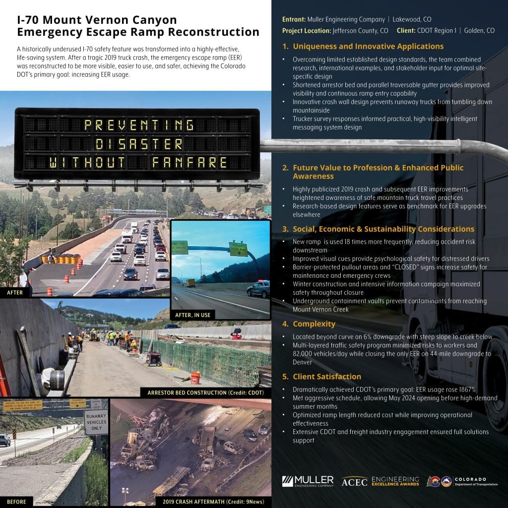 Muller Engineering Company (Muller), in conjunction with its project partners, was honored with the American Council of Engineering Companies (ACEC) 2026 Engineering Excellence Award for the I-70 Mount Vernon Emergency Escape Ramp Reconstruction project. Read about all of the winners on the ACEC website here.